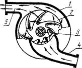 Центробежный насос состоит из кор- пуса 1 (рис. 170), крыльчатки 2, установ- ленной на валике 3, и уплотнительного уст- ройства. Валик 3 приводится во вращение от двигателя. Вода по патрубку 4 посту- пает внутрь корпуса 1, к центру крыль- чатки 2. При вращении крыльчатки вода отбрасывается центробежной силой к стенкам корпуса, откуда вытес- няется в водяную рубашку двигателя через отводящий патрубок 5, рас- положенный по касательной к корпусу.