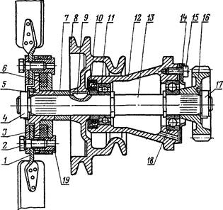 Особенностью вентилятора дизеля ЯМЭ-238НБ является наличие упругой муфты, предохраняющей детали привода вентилятора от поло- мок при резком изменении частоты вращения. Устроена муфта следую- щим образом. Стальная ступица 5 (рис. 172) насажена на шлицы вала 13 и закреплена гайкой 4. На ступицу с небольшим зазором установлен стальной диск 3. Резиновый элемент 6 привулканизирован к ступице 5 и диску 3. Четыре упорных втулки 19 с внутренней резьбой приварены к диску 3 и проходят через резиновый элемент 6. Шестилопастная крыль- чатка 1 вентилятора закреплена болтами 2 во втулках 19.