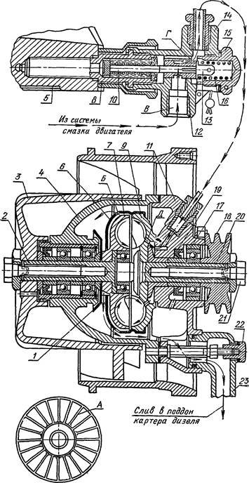 В направляющем аппарате 11 сделан канал, в насосном колесе гидромуфты — отверстие Д, по которым масло из системы смазки дя- зеля подается в гидромуфту, а в кожухе 6 имеется калиброванное от- верстие Б, через которое масло из гидромуфты по патрубку 23 сли- вается в поддон картера дизеля.