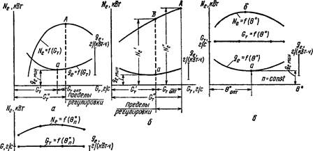 Регулировочная характеристика по установочному углу опережения впрыска топлива (дизель) отражает зависимость эффективной мощнос- ти Neи удельного расхода топлива geот угла начала подачи топлива 0° при расходе топлива GT=const (рис. 202,г).