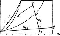 Отметим на кривой Ne=f(G т) точки А и В. В точке В мощность двигателя N'eсоответствует минимальному удельному расходу топлива ge мин- По мере увеличения подачи топлива значение коэффициента из- бытка воздуха уменьшается и наступает момент, когда двигатель из-за неполного сгорания начинает работать с дымным выпуском (точка А). Начало дымления двигателя соответствует мощности N"e.