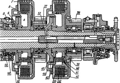 На валу 1 размещены фрикционные муфты IV, III, II и I соответ- ственно четвертой, третьей, второй и первой передач. Ведущие части фрикционных муфт сидят на шлицах первичного вала 51, а ведомые с шестернями 35, 36, 37, 38 установлены на нем в подшипниках.