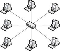 Рисунок 8.1 - Топология типа «звезда» Преимущества сетей топологии звезда: · легко подключить новый ПК; · имеется возможность централизованного управления; · сеть устойчива к неисправностям отдельных ПК и к разрывам соединения отдельных ПК. Недостатки сетей топологии звезда: · выход из строя центрального концентратора обернётся неработоспособностью сети (или сегмента сети) в целом; · для прокладки сети зачастую требуется больше кабеля, чем для большинства других топологий; · конечное число рабочих станций в сети (или сегменте сети) ограничено количеством портов в центральном концентраторе.