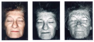 Text А. What is Aging Skin? We begin to age the moment we are born, and throughout our lives the effects of aging are evident in our bodies. Up to about age 20 years, the most visually prominent effects of aging are in growth and development. Beginning in our 20s, the effects of aging begin to be visible in the skin. Genetically programmed chronologic aging causes biochemical changes in collagen and elastin, the connective tissues that give skin its firmness and elasticity. The genetic program for each person is different, so the loss of skin firmness and elasticity occurs at different rates and different times in one individual as compared with another. As skin becomes less elastic, it also becomes drier. Underlying fat padding begins to disappear. With loss of underlying support by fat padding and connective tissues, the skin begins to sag. It looks less supple, and wrinkles form. The skin may be itchy with increased dryness. A cut may heal more slowly. Simultaneously with genetically programmed aging, the process of photoaging may be taking place. Photoaging is the effect of chronic and excessive sun exposure on the skin. Cigarette smoking also contributes to aging effects by the biochemical changes it brings about in skin tissues. Photoaging interacts with chronologic aging and may appear to hasten the process of chronologic aging. In fact, photoaging may be responsible for the majority of age-associated changes in the skin’s appearance: mottled pigmentation, surface roughness, fine wrinkles that disappear when stretched, "age" or "liver" spots (lentigines) on the hands, and dilated blood vessels. Chronic sun exposure is a major risk factor for skin cancers—basal cell carcinoma, squamous cell carcinoma and melanoma. The effects of photoaging accumulate over years of chronic sun exposure. At first, the effects may be invisible to the casual glance, even while they are on the increase. Photos taken with ultraviolet light will dramatically reveal the accumulative effects of chronic sun exposure. In the following series of photos the accumulative effects of chronic sun exposure are clearly seen. In each set of photos, the two pictures on the left were taken in ordinary light, the picture on the right in ultraviolet light: