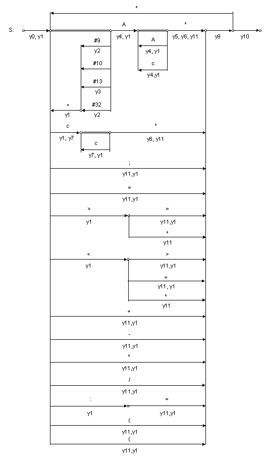 Рис. 6. R-схема лексического анализатора языка МИЛАН Рассмотрим семантические функции к R-схеме лексического анализатора языка МИЛАН. Введем следующие обозначения: - $Position - текущая позиция в строке, просматриваемая лексическим анализатором; - $Number_String - текущая строка программы, просматриваемая лексическим анализатором; - * - при любом условии (любой символ). Семантические функции к R-схеме лексического анализатора: y0: подготовка (инициализация таблиц и переменных), $Position=0, $Number_String=1; y1: чтение следующего символа программы на языке МИЛАН; y2: увеличение счётчика текущей позиции ($Position++); y3: переход на новую строку в программе, увеличение счётчика текущей строки, и сброс счётчика позиции ($Number_String++, $Position=0); y4: накопление символов ключевого слова или идентификатора; y5: проверка на принадлежность выделенного слова к ключевым словам; y6: проверка на принадлежность выделенного слова к идентификаторам; y7: накопление символов константы; y8: проверка на принадлежность выделенной константы таблице констант; y9: запись сформированной лексемы в массив лексем; y10: завершение работы лексического анализатора; y11: формирование лексемы; Ограничения: Программа на языке МИЛАН должна содержать <=15 идентификаторов, <= 15 констант, <=500 лексем Пример №1: Рассмотрим пример обработки лексическим анализатором программы на языке МИЛАН, вычисляющую сумму пяти вводимых чисел.