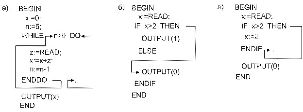 В языке МИЛАН имеются операторы, изменяющие линейный порядок вычислений. Это операторы цикла и развилки. Для организации правильных вычислений необходимо на некоторые лексемы поставит ссылки на номера лексем, куда будет передано управление при выполнении определенных условий. Такие ссылки будем записывать на место значения лексемы. Для оператора цикла на лексему DO необходимо поставить ссылку $r - номер лексемы, следующей за лексемой ENDDO. На эту лексему будет передано управление, если условие цикла - ложь. Для лексемы ENDDO поставить ссылку $s - номер лексемы WHILE, увеличенный на 1. Это лексема, с которой начинается условие цикла. На нее передается управление после выполнения тела цикла (рис. 7, а). Для оператора развилки на лексему IF необходимо поставить ссылку $r - номер лексемы, стоящей после лексемы ELSE в полной форме оператора развилки (рис. 7, б), и стоящей после лексемы ENDIF в сокращенной форме (рис. 7, в). На эти лексемы передается управление при ложном условии оператора развилки.