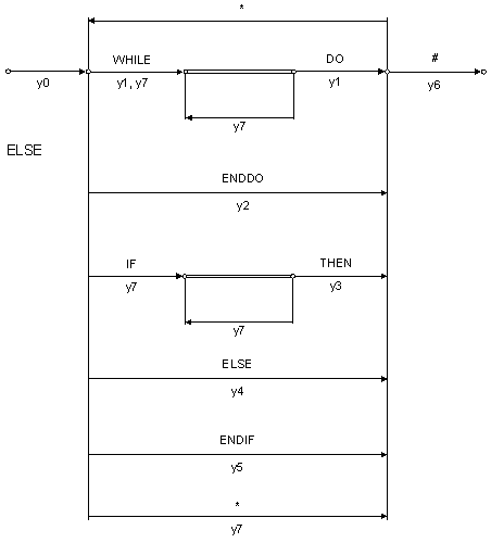 Рис. 8. R-схема расстановки ссылок Семантические функции к R-схеме расстановки ссылок: y0: подготовка (инициализация стеков и переменных), номер очередной лексемы $Number_Lexem=1, прочитать лексему с номером $Number_Lexem; y1: значение $Number_Lexem занести стек $Stek_do ($Number_Lexem→$Stek_do); y2: снять вершину стека $Stek_do в переменную $s ($s ← $Stek_do), снять вершину стека $Stek_do в переменную $r ($r ← $Stek_do), значение $r+1 присвоть лексеме с номером $Number_Lexem [ENDDO→WHILE+1]($Tab_Lexems[$Number_Lexem]->Value=$r+1), значение $Number_Lexem+1 присвоить лексеме с номером $s [DO→ENDDO+1] ($Tab_Lexems[$s]->Value=$Number_Lexem+1); y3: значение $Number_Lexem занести в стек $Stek_if ($Number_Lexem→$Stek_if); y4: снять вершину стека $Stek_if в переменную $r ($r ← $Stek_if), присвоить значение $Number_Lexem+1 лексеме c номером $r [THEN→ELSE+1] ($Tab_Lexems[$r]->Value=$Number_Lexem+1), занести в $Stek_if значение $Number_Lexem ($Number_Lexem→$Stek_if); y5: снять вершину стека $Stek_if в переменную $r ($r←$Stek_if), присвоить значение $Number_Lexem+1 лексеме c номером $r [THEN→ENDIF+1, ELSE→ENDIF+1] ($Tab_Lexems[$r]->Value=$Number_Lexem+1) занести в $Stek_if значение $Number_Lexem ($Number_Lexem→$Stek_if); y6: завершить работу; y7: $Number_Lexem++, прочитать очередную лексему с номером $Number_Lexem;