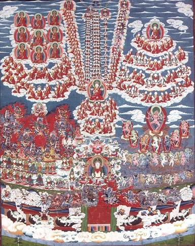 Сострадание. Например: мы идем и видим букашку, она лежит на спине и не может перевернуться. Мы испытываем чувство, которое можно классифицировать как сострадание, у нас появилось желание помочь ей. Желание помочь – это есть проявление сострадания. Когда мы подходим к этой букашке и переворачиваем ее чтобы она убежала – это уже проявление любви. Любовь и сострадание идут вместе. К Состраданию и Любви – двум основам фундаментальных составляющих присоединяется Шесть, или Десять Парамит, то есть дают классификацию как Шести Парамитам, так и Десяти Парамитам. Парамита – это «Ушедшая за предел». К Парамите относяться Парамита Даяния, Нравственности, Усердия, Терпения и так далее. Намерение Любви, Сострадания, Равностное отношении ко всем живым существам подобным проявлениям этих чувств к родной матери, проявляет у нас намерение практиковать и следовать этим Великим Неизмеримым Состояниям. Так зарождается стремление к пробуждению Боддхичитты и мы стремимся практиковать и развивать эти садхану. Во время практики Бодхичитты у нас визуализация точно такая как и во время практики принятия Прибежища. Мы визуализируем перед собой Древо Прибежища со всеми Буддами, Бодхисаттвами, Свастикосаттвами.