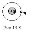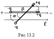 Диэлектриками называют тела, не проводящие электрического тока вследствие отсутствия свободных носителей заряда. При изменении внешних условий (нагревание, облучение и т.д.) диэлектрик может проводить электрический ток. При помещении диэлектрика в электрическое поле происходит смещение атомов или молекул, входящих в состав диэлектрика от положения равновесия. Изменение состояния диэлектрика при помещении его в электрическое поле объясняется его молекулярным строением. По своим электрическим свойствам молекулы диэлектрика подобны электрическим диполям (Рис.13.1). Диполь - система из двух одинаковых по величине, но противоположных по знаку зарядов, расположенных на некотором расстоянии L, характеризующаяся вектором дипольного момента: