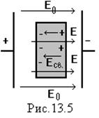Третий класс - кристаллические диэлектрики (NaCl, CsCl и др.), решетка которых состоит из положительных и отрицательных ионов. Такой диэлектрик схематически можно рассматривать как совокупность двух ²подрешеток², одна из которых заряжена положительно, другая - отрицательно. При отсутствии внешнего поля подрешетки расположены симметрично и суммарный электрический момент равен нулю. Помещая диэлектрик в поле, происходит смещение подрешетки и диэлектрик приобретает электрический момент. Все эти процессы – диэлектрическая поляризация. Поляризацией диэлектрика называется возникновение в нем при внесении во внешнее электрическое поле макроскопического собственного (внутреннего) электрического поля, обусловленного смещением заряженных частиц, входящих в состав молекул диэлектрика. Диэлектрик, в котором возникло такое поле, называют поляризованным. Различают три вида поляризации: 1. ориентационную поляризацию с полярными молекулами, которая возрастает с увеличением напряженности электрического поля и убывает при повышении температуры (Рис.13.2); 2. электронную поляризацию диэлектрика с неполярными молекулами, состоящую в возникновении у каждой молекулы индуцированного электрического момента (Рис.13.4); 3. ионную поляризацию в кристаллических диэлектриках, имеющих ионные кристаллические решетки. Она состоит в смещении положительных ионов решетки вдоль направления поля, а отрицательных ионов в противоположную сторону. Мерой поляризации диэлектрика является вектор поляризации (поляризованность) где N - число диполей - молекул, содержащихся в объеме V диэлектрика, Рассмотрим диэлектрик во внешнем электрическом поле напряженностью
