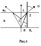 В точку В, находящуюся на нижней поверхности стеклянной пластинки, падают два луча света. Один луч падает нормально (перпендикулярно) к её поверхности и поэтому проходит сквозь пластинку не преломляясь, и выходит в воздух в точке А. Второй луч преломляется и выходит из пластинки в точке Д по направлению к точке О. Так как стекло - более оптически плотная среда по сравнению с воздухом, т.е.n>n0,то угол падения a луча ВД будет меньше, чем угол преломления g луча ДО. Если смотреть из точки О, то мы будем видеть точку пересечения лучей ДО и ВА не в точке В, а в точке С. Таким образом, толщина стеклянной пластинки будет казаться равной АС, т.е. меньшей, чем истинная толщина АВ. Так как в микроскоп падает очень узкий пучок лучей и углы a и g малы, а для малых углов справедливо равенство, что: sina=tga и sing=tgg. Тогда закон преломления (6) для нашего случая примет вид: , (7) но, учитывая, что n0 - абсолютный показатель преломления воздуха, а скорость света в воздухе такая же как и в вакууме, т.е. vвозд.=с, то используя выражение (5), находим, что n0=1. Используя данный результат, выразим абсолютный показатель преломления стекла из формулы (7):. (8) Но из рис.4: и, тогда:, а учитывая, что: АД=ВВ1 , АС=Н - кажущаяся толщина пластинки, а ДВ1=d - истинная толщина пластинки, то окончательное выражение для нахождения абсолютного показателя преломления n примет вид: . (9) Таким образом, исходя из формулы (9), показатель преломления показывает во сколько раз истинная толщина пластинки больше мнимой. Порядок выполнения задания №2 1. Микрометрический винт микроскопа установить на положение 0 (в положение упора). Кремальерой микровинта сфокусировать поверхность сетки Горяева. 2. Поместить на сетку Горяева исследуемую стеклянную пластинку и через неё вновь сфокусировать поверхность сетки, вращая только микрометрический винт, в процессе вращения отсчитывая количество делений по шкале микровинта. В положение микровинта, при котором четко видна сетка - мы видим нижнюю мнимую поверхность исследуемого стекла - число “А”. 3. Продолжая вращать микрометрический винт, навести на резкость верхнюю поверхность исследуемой стеклянной пластинки. Отсчитать по шкале микровинта число делений “В”, учитывая число оборотов. В положении микровинта - “В” мы видим реальную верхнюю поверхность стекла. 4. Величина “В”, умноженная на шаг микровинта k даст истинную толщину пластинки - d (т.к. его ход начался с “0”). Разность В-А, умноженная на шаг микровинта, даст нам Н - кажущуюся толщину пластинки. Согласно формуле (9) имеем: d=kB, H=k(B-A), тогда: (10) 5. По формуле (10) вычислить показатель преломления стекла. 6. Произвести измерения ещё два раза. Найти среднее значение абсолютного показателя преломления nср. . Оценить погрешности. 7. Провести аналогичные измерения и вычисления показателя преломления оргстекла. 8. Результаты измерений и вычислений занести в таблицу.