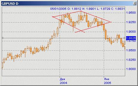 Рис.4.4.5. Фигура «тройная вершина» Данная фигура относится к тем, что наиболее редко встречаются на графиках цен среди классических фигур. Паттерн «бриллиант» на графике выглядит сначала как расширяющийся, а затем как сужающийся диапазон ценовых колебаний. При этом период расширения колебаний приблизительно идентичен периоду их сужения и в целом эта фигура походит на ромб. На крупномасштабных таймфреймах (от одного дня и выше) фигура является как правило разворотной, а на более мелких таймфреймах (менее дня) паттерн на способен указать на дальнейшее направление рынка. Пример фигуры бриллиант на графике:
