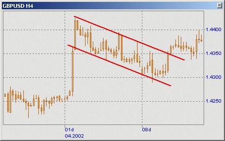 Рис.4.4.12. Фигура «восходящий флаг» Флаг означает, что на рынке складывается ситуация, при которой ускорившееся движение уже обогнало фундаментальные факторы, которые ложатся в основе дисбаланса спроса и предложения. Следовательно рынку требуется «передохнуть» перед «следующим броском».