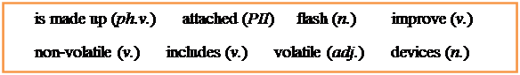 A PC system consists of two parts: software and hardware. Software is the programmes that enable a computer to perform a specific task. It includes the operating system and application software, such as a graphics package and a web browser. Hardware is any electronic or mechanical part. The basic structure of a computer system is made up of three main hardware sections: the central processing unit – the CPU, the main memory, and the peripherals. The CPU is a processor chip which executes programme instructions and coordinates the activities of all the other components. In order to improve the computer's performance, the user can add expansion cards for video, sound and networking. The main memory holds the instructions and the data which is currently being processed by the CPU. This internal memory is made up of ROM and RAM chips. RAM, or random access memory, is volatile, so it loses the stored data when the power is turned off. ROM, or read-only memory, is non-volatile. The peripherals, or peripheral devices, are the physical units attached to the computer. They include input, output and storage devices. Input devices, for example the keyboard and the mouse, enable us to present information to the computer. Output devices allow us to extract the results from the computer. For instance, we can see the output on the monitor or in printed form. Storage devices are used to store information permanently. For example, we use hard disks, DVDs or flash drives to store large amounts of information. Sources of information: 1. S. R. Esteras. Infotech English for Computer Users, 4th edition (Student’s book, Teacher’s book, Workbook + audio) – Cambridge University Press, 2009. – 168pp. 2. S. R. Esteras, E. M. Fabre. Professional English in use: ICT – Cambridge University Press, 2007. – 117 pp. Vocabulary: 1) software – программное обеспечение 2) hardware – аппаратное обеспечение 3) an operating system (OS) – операционная система 4) a graphics package – пакет программ для машинной графики 5) the CPU – central processing unit – процессор 6) computer’s performance – работа компьютера (производительность) 7) an expansion card – карта расширения, плата расширения 8) an expansion slot – слот расширения 9) main memory, internal memory – память компьютера 10) RAM – random access memory – память случайного доступа, оперативная память, оперативное запоминающее устройство, ОЗУ 11) ROM – read only memory – постоянное запоминающее устройство, ПЗУ 12) volatile – энергозависимый 13) non-volatile – энергонезависимый 14) peripheral devices (peripherals) – периферийные устройства 15) input devices – устройства ввода информации 16) output devices – устройства вывода информации 17) storage devices – устройства хранения информации 18) to enter/input/feed information into the computer, to present information to the computer – вводить информацию в компьютер 19) to extract/output the results from the computer – извлекать полученные результаты из компьютера 20) permanent – постоянный 21) temporary – временный 22) flash drive – флеш-накопитель, флешка Exercises: I. Complete the collocations: 1. an operating a) memory 2. internal b) devices 3. storage c) slot 4. the central processing d) system 5. an expansion e) browser 6. a web f) unit II. Complete the sentences with correct word from the box: