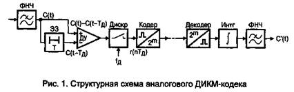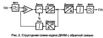 Схема кодека (см. рис. 2), является более сложной по сравнению со схемой (см. рис. 1), так как предыдущая входная величина восстанавливается с помощью цепи обратной связи, в которой накапливаются кодированные разности значений отсчетов. По существу сигнал в цепи обратной связи представляет оценку входного сигнала, которая получается путем интегрирования кодированных разностей отсчетов.