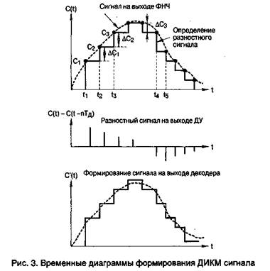 Преимущество реализации кодека ДИКМ с цепью обратной связи состоит в том, что при этом шумы квантования не накапливаются неограниченно. Если сигнал в цепи обратной связи отклоняется от входного в результате накопления шумов квантования, то при следующей операции кодирования разностного сигнала это отклонение автоматически компенсируется. В системе без обратной связи выходной сигнал, формируемый декодером на противоположном конце линии, может неограниченно накапливать шумы квантования. Временные диаграммы, поясняющие принцип работы декодека ДИКМ, приведены на рис. 3. В начальный момент ti сигнал на выходе интегратора отсутствует, а сигнал на выходе дифференциального усилителя (ДУ) соответствует непрерывному сигналу. Дискретный отсчет с амплитудой d квантуется и кодируется в кодере и затем через декодер поступает на интегратор (Интг), который запоминает его амплитуду до момента Как видно из рис. 3, амплитуда разностей отсчетов меньше самих отсчетов, поэтому при одинаковом шаге квантования число разрядов в кодовой комбинации при ДИКМ меньше, чем при обычной ИКМ. Эффективность ДИКМ можно проиллюстрировать следующим примером. Пусть преобразованию на основе ДИКМ подвергается синусоидальный сигнал с частотой 800 Гц и амплитудой Uc