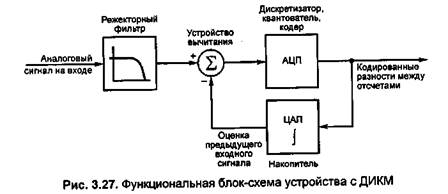 амплитуду разностного сигнала можно получить путем дифференцирования c(t) и деление её на временной интервал между отсчетами Дифференциальная импульсно-кодовая модуляция (ДИКМ) разработана специально для того, чтобы использовать преимущества, которые дает избыточность отсчетов речевого сигнала. Так как диапазон изменения разностей отсчетов меньше диапазона изменения самих отсчетов, то для кодирования этих разностей необходимо всего несколько разрядов. Частота дискретизации, как правило, не изменяется по сравнению с системами с обычной ИКМ, т.е., как и в системах с ИКМ, в кодере используется режекторный фильтр, а в декодере — сглаживающий. Метод генерации разностей между отсчетами в ДИКМ-кодере состоит в запоминании значения предыдущего отсчета в схеме выборки-хранения и использовании аналогового вычитающего устройства для вычисления изменения. Изменение сигнала затем квантуется и кодируется для передачи. Однако схема ДИКМ, показанная на рис. 3.27, сложнее из-за того, что предыдущее входное значение здесь восстанавливается при помощи цепи обратной связи, которая интегрирует кодированные значения разностей отсчетов. По существу, сигнал обратной связи представляет собой оценку входного сигнала, полученную путем интегрирования кодированных разностей отсчетов. Поэтому сигнал обратной связи, полученный таким же способом, используется и для восстановления сигнала в декодере. Преимущество использования обратной связи состоит в том, что ошибки квантования не накапливаются неограниченно. Если сигнал обратной связи отклоняется от входного сигнала из-за накопления ошибок квантования, то при кодировании следующего разностного сигнала это отклонение автоматически компенсируется. В системах без обратной связи на выходе декодера на другом конце соединения ошибки квантования могут накапливаться неограниченно.