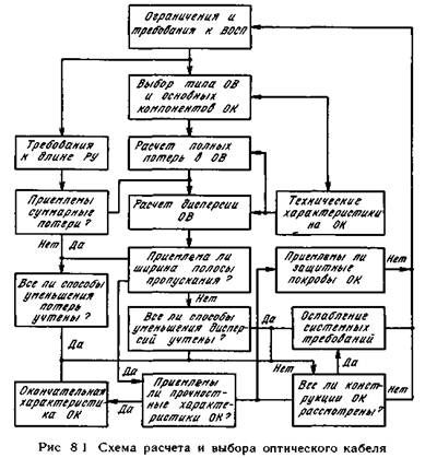 Проектирование передатчика заключается в основном в определении типа источника излучения и схемы модуляции. При выборе источника передатчика учитывают следующие параметры: оптическую мощность источника; длину волны и спектральную ширину излучения; скорость и линейность отклика; температурную нестабильность и эффективность схемы температурной компенсации. Значение оптической мощности источника определяется требуемым уровнем сигнала в блоке приемника с учетом всех потерь в ОК и на стыковку элементов. Длина волны выбирается вблизи длин волн, соответствующих минимальным значениям затухания ОВ, а для ООВ с учетом оптимальных длин волн, при которых дисперсия этих ОВ принимает значения, близкие к нулю. Кроме того, необходимо также учитывать спектральную чувствительность детектора. Требования к спектру источника ограничиваются в основном шириной полосы пропускания ВОЛС и требуемой скоростью передачи. Требования к скорости и линейности отклика источника излучения зависят от системы передачи. При организации АСП основные требования предъявляются к линейности модуляционной характеристики источника, которая зависит от допустимого уровня искажения сигналов. Для выполнения этих требований в связи с относительно невысокой линейностью источников излучения приходится ограничивать мощность источника, информационную полосу сигналов, а также предельную длину ВОКМ (обычно двумя — тремя РУ). При использовании цифровой модуляции необходимо учитывать быстродействие источника излучения и выбранный способ кодирования.