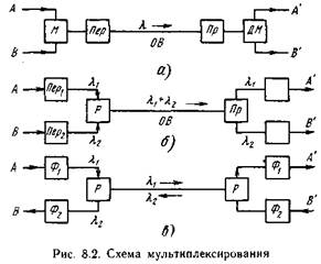 После выбора источника излучения и схемы модуляции проверяют достаточность вводимой в ОВ оптической мощности, а затем рассчитывают и фиксируют следующие параметры: отношение сигнал-шум, потребляемую мощность и влияние изменения температуры на мощность излучаемого сигнала. При необходимости в проекте передатчика следует предусмотреть меры по температурной компенсации изменений така питания источника с помощью соответствующей схемы обратной связи или точного регулятора тока, а также мультиплексирование. Мультиплексирование осуществляется для увеличения информационной емкости ОК путем объединения сигналов от двух или нескольких передатчиков в один групповой сигнал. Это объединение производят до или после преобразования оптических сигналов в электрические. На рис. 8.2 представлены простейшие варианты объединения двух сигналов в одном ОВ. При мультиплексировании электрических сигналов (рис. 8.2, а) две серии импульсов, поступающих со входов А и В, с помощью мультиплексора М объединяются в определенной последовательности в один групповой сигнал. Групповой сигнал в оптическом передатчике Пер модулирует оптический сигнал, направляемый в ОВ. В оптическом приемнике Пр сигнал вновь превращается в электрический. В демульти- плексоре ДМ этот сигнал разделяется на две серии импульсов, тождественных входным, которые передаются на входы При мультиплексировании оптических сигналов (рис. 8.2, б) две серии электрических импульсов со входов А и В поступают в оптические передатчики