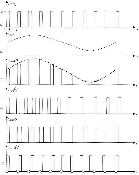а) несущая последовательность прямоугольных импульсов; б) модулирующий сигнал; в) амплитудно-импульсно-модулированный сигнал; г) частотно-импульсно-модулированный сигнал; д) широтно-импульсно-модулированный сигнал; е) фазо-импульсно-модулированный сигнал.