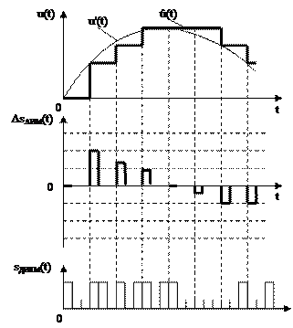 Рисунок 24.2 – Принцип формирования ДИКМ сигнала. Шум квантования при ДИКМ меньше, чем при ИКМ при том же числе уровней квантования. Качество передачи при ДИКМ такое же, как и при ИКМ при меньшем числе символов в кодовой комбинации (на один-два и белее символов). Шум ложных импульсов при ДИКМ в большей мере, чем при ИКМ, ухудшает верность приема. 24.3 Дельта-модуляция Дельта-модуляция (ДМ) – представление значений отсчетов сигнала ошибки предсказания с помощью двухуровнего (+1 или -1) одноразрядного кода при большой частоте дискретизации. Сигнал на выходе дельта-модулятора содержит лишь сведения о полярности (знаке) сигнала ошибки предсказания.