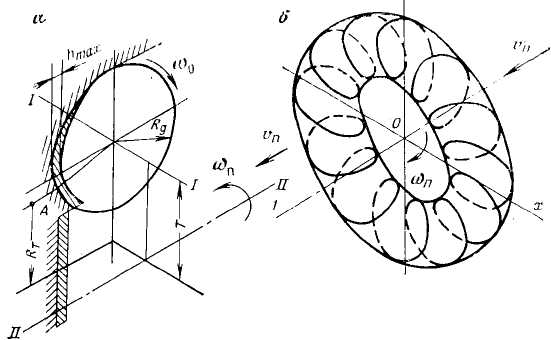 Планетарные исполнительные органы проходческих комбайнов имеют различное конструктивное исполнение, обеспечивающее, как правило, рабочему инструменту два вращательных движения — относительное и переносное. При этом исполнительный орган разрушает забой либо прорезанием концентрических щелей и скалыванием межщелевых целиков (по схеме работы комбайнов ПКГЗ, ПКГ4), либо путем резания с открытой поверхности забоя (по схеме ТПК1 или К.7/15). К планетарным органам разрушения относят и исполнительный орган комбайна ТОР72, разрушающий забой дисковыми шарошками, работающими в режиме подрезного резания, и исполнительные органы комбайнов «Ясиноватец» и «Союз-19». Исполнительные органы типа ТПК являются плоскопланетарными, а типа ПКГ и К7/15 — пространственнопланетарными. Последние требуют резцов специальной конструкции, так как применение обычных резцов приводит к работе не только передней, но и боковой гранями, что резко повышает энергетические показатели процесса разрушения. К достоинствам планетарных органов можно отнести возможность создания сетки пересекающихся резов, что снижает энергоемкость процесса разрушения. Резцовый инструмент исполнительного органа комбайна К7/15 совершает сложное движение со скоростью ω0 (рис. IV.69, а)по спирали с радиусом R д при одновременном переносном движении со скоростью ωп, по радиусу тора R Т, при этом получается спираль замкнутая в тор (рис. IV.69, б).