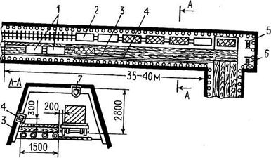 После подготовки монтажной камеры устраивают приемную и комплектовочную площадки. Приемная площадка представляет собой пункт разгрузки и расположения по крайней мере односменного запаса оборудования под монтаж, а также перегрузки оборудования на другие доставочные средства, обмена транспортных средств и хранения мелких деталей комплекса, резервного монтажного оснащения (рис. 31). Приемная площадка выбирается на пути электровозной доставки у сопряжения с безрельсовой выработкой, ведущей к монтажной камере. В однопутной тупиковой выработке рельсовый путь смещается от оси выработки так, чтобы оставалось место для устройства разгрузочного полка шириной 1,5 и длиной 35-40 м. Высота выработки на приемной площадке должна обеспечивать возможность установки технических средств механизации работ. При деревянной крепи выработки на всю длину приемной площадки необходимо проложить (по стойкам крепи) опорную балку 4, состоящую из 4-метровых отрезков спецпрофиля, на которые устанавливают отводные блоки стягивающей лебедки. При металлической крепи блоки крепят за ее элементы без применения опорных балок. Опорную балку устанавливают на высоте 0,3-0,4 м от полка, чтобы при стягивании не происходило опрокидывания груза с площадки.
