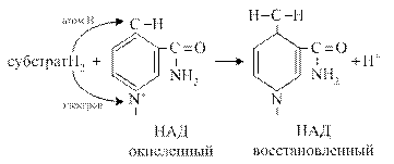 НАД и НАДФ непрочно связаны с белковой частью фермента. В данной реакции непосредственным акцептором протонов и электронов в составе НАД или НАДФ является никотинамид (витамин РР). В последующем НАДН2 используется в энергетических процессах, а НАДФН2 служит источником водорода для восстановительных синтезов (синтез жирных кислот, стероидных гормонов, холестерина). Механизм восстановления кофермента
