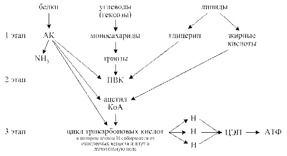 Катаболизм основных органических веществ протекает в несколько этапов. На первом этапе происходит распад сложных веществ до их составных компонентов: белков – до аминокислот, жиров – до глицерина и жирных кислот, углеводов - до моносахаридов. Эти реакции специфичны и не сопровождается высвобождением энергии. На втором этапе образующиеся мономеры с помощью специфических реакций превращаются в два общих продукта распада: пировиноградную кислоту и ацетил-КоА. На втором этапе высвобождается четверть энергии, заключённой в исходных органических веществах. На третьем этапе общие продукты катаболизма: пировиноградная кислота (ПВК) и ацетил - КоА включаются в дальнейшее окисление. На этом этапе высвобождается 2/3 всей энергии. Если в процессе катаболизма белков, жиров, углеводов образуется ПВК, для дальнейшего окисления необходим переход её в ацетил-КоА. Этот процесс называется окислительным декарбоксилированием пировиноградной кислоты. Он включает два вида реакций: окисление и образование СО2 путём разрушения карбоксильной группы. Окислительное декарбоксилирование пирувата осуществляется при участии пируватдегидрогеназного комплекса.