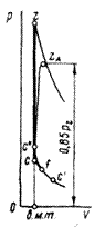 Процесс сгорания — основной процесс рабочего цикла двигателя, в течение которого теплота, выделяющаяся вследствие сгорания топлива, идет на повышение внутренней энергии рабочего тела и на совершение механической работы. Изменение давления в процессе сгорания топлива в двигателе с воспламенением от искры показано на рис. 15, а в дизеле — на рис. 16. Кривые c'fc"z дсхематически показывают действительное изменение давления в цилиндрах двигателей в процессе сгорания. В реальных двигателях процесс сгорания, точнее — догорания топлива, продолжается и за точкой z дна линии расширения. На характер протекания процесса сгорания оказывает влияние большое число различных факторов: параметры процессов впуска и сжатия, качество распиливания топлива, частота вращения коленчатого вала двигателя и т. д. Зависимость параметров процесса сгорания от целого ряда факторов, а также физико-химическая сущность процесса сгорания моторных топлив пока что изучены недостаточно полно. С целью упрощения термодинамических расчетов автомобильных и тракторных двигателей принимают, что процесс сгорания в двигателях с воспламенением от искры происходит при V= const, т. е. по изохоре (рис. 15, прямая cc"z), а в двигателях с воспламенением от сжатия — при V= const и р= const, т. е. по циклу со смешанным подводом теплоты (рис. 16, прямые сс" z'/ и z'z). Целью расчета процесса сгорания является определение температуры и давления в конце видимого сгорания (точки z и z д), а для дизеля — и объема Vz. Температура газа Tz в конце видимого сгорания определяется на основании первого закона термодинамики, согласно которому