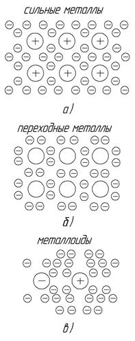 В процессе охлаждения расплава тепловые колебания и перемещения атомов все более ограничиваются так, что на расстояниях r, превышающих межцентровую величину d0, энергия притяжения преобладает над энергией отталкивания и атомы сближаются. При малых расстояниях r начинает быстрее возрастать энергия отталкивания и, когда произойдет касание внешних электронных оболочек на расстоянии d0, результирующая энергия взаимодействия атомов становится минимальной. В таком случае при остывании материала они занимают равновесное, устойчивое положение, потому что для перехода атомов из этого состояния необходимо преодолеть значительную энергию их отталкивания либо притяжения. Этим создается периодическое пространственное расположение атомов на расстояниях d0 с минимальным запасом свободной энергии, что и представляет кристаллическое строение материалов. Указанное постоянное положение атомов распространяется на значительные расстояния и характеризует их дальний порядок. Если атомы расплава имеют малые значения энергии взаимодействия, то при охлаждении они не могут приобретать устойчивость, так как под воздействием внешних сил продолжают переходить в новые положения. После остывания такого расплава его атомы остаются расположенными хаотично, формируя аморфную структуру материала. При этом в небольших группировках атомов может возникать и разрушаться динамическое подобие их правильного расположения, составляя ближний порядок. Сильная межатомная связь, создающая кристаллическую структуру элементов, в зависимости от числа электронов на внешней оболочке и количества электронных оболочек атома проявляется в нескольких основных видах Металлическая связь возникает при наличии на внешней оболочке слабосвязанных с ядром валентных электронов, которые, легко перемещаясь по внешним оболочкам соседних атомов, становятся коллективизированными электронами (рис. 2, а). Отдавая свои валентные электроны в «коллективное пользование», атомы превращаются в положительные ионы, окруженные подобием электронного газа. Это создает кулоновские силы взаимодействия зарядов, что удерживает ионы-атомы в устойчивых положениях, формируя кристаллическую решетку типа электронного кристалла и придавая ему характерные металлические свойства. Такой вид межатомной связи устанавливается при наличии на внешней оболочке менее четырех электронов и увеличенном общем количестве элетронных оболочек. Следовательно, у элементов, расположенных в периодической системе левее и ниже, усиливаются металлические свойства. Ковалентная связь осуществляется в случае более сильного притяжения внешних электронов к ядру (рис. 2, б). При этом такие электроны двух или более атомов коллективизируются в пары, которые перемещаются одновременно по внешним оболочкам двух атомов. Кулоновские силы взаимодействия этих электронов с ядрами двух атомов обеспечивают парноэлектронную связь и устойчивость атомов в равновесном положении. При таких условиях образуется валентный кристалл со свойствами переходного типа между металлами и металлоидами. Этот вид связи возникает у элементов с увеличенным до четырех-семи числом внешних валентных электронов и небольшим количеством внутренних электронных оболочек.