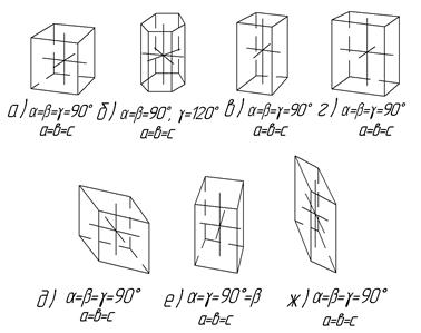 Рис. 4. Виды кристаллографических систем: а – кубическая, б – гексагональная, в – тетрагональная, г – ромбическая, д – ромбоэдрическая, е – моноклинная,