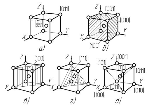 Рис.6. Основные кристаллографические координаты, плоскости и направления решетки ОЦК: а – координаты атомов, б – индексы плоскостей граней куба; в – индексы вертикальной диагональной плоскости куба; г – индексы наклонной диагональной плоскости куба; д – индексы направлений куба Совокупность кристаллографически идентичных параллельных направлений обозначается индексами одного из таких направлений, помещенных в угловые скобки. Например, индексы для совокупности направлений диагонали куба - Гексагональная кристаллографическая система для обозначения атомных плоскостей и направлений требует применения четырех координатных осей с использованием четырехзначных числовых индексов. А н и з о т р о п и я кристаллов характеризуется зависимостью их физико-механических свойств от нпарвления действия внешних факторов, что проявляется в однородном монокристалле с определенной геометрической ограненной формой. Подобная неодинаковость свойств касается упругости, прочности, теплового расширения, теплопроводности, скорости света (в прозрачных кристаллах), скорости звука, что объясняется разной плотностью упаковки атомов в различных кристаллографических плоскостях и направлениях. Поэтому, например, под действием механической нагрузки на монокристалл его деформация легче начинается по плоскостям и направлениям с наиболее плотной упаковкой атомов. Это происходит как сдвиг тонких слоев – пачек – монокристалла относительно друг друга по таким плоскостям и направлениям – системам скольжения. И з о т р о п и я аморфных материалов с хаотичным пространственным расположением атомов представляет одинаковость их свойств при различных направлениях воздействия внешних факторов. Это связано с однородной во всех направлениях плотностью упаковки атомов в аморфных материалах. Металлические материалы состоят из множества анизотропных кристаллов с различной кристаллографической ориентацией и границами между ними, представляющих кристаллические зерна. Анизотропность каждого кристаллического зерна нивелируется анизотропностью соседних разориентированных зерен так, что свойства такого поликристаллического мтеалла не зависят от направления действующих факторов, и металл в целом является изотропным, или псевдоизотропным. Если кристаллическим зернам придать одинаковую общую ориентацию, то структура металла приобретает направленность, называемую текстурой, чем создается анизотропия металла. Такая текстура может быть получена за счет воздействия на металл различными технологическими методами, например, обработкой давлением с протеканием процессов значительной холодной пластической деформации. П о л и м о р ф и з м или а л л о т р о п и я предстаяляет способность некоторых металлов и других кристаллических элементов существовать в нескольких кристаллических формах, переходя из одной в другую при изменениях окружающей температуры либо при действии больших давлений. Эта способность связана со стремлением атомов занять в решетке положения с наименьшим запасом свободной энергии. Полиморфные превращения происходят при определенных температурах и сопровождаются экзо- или эндотермическим эффектом. При этом происходит перекристаллизация, изменяются структурное состояние элемента, его основные физико-химические и механ