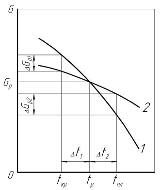 Формирование кристаллической структуры металлов происходит в процессе их охлаждения из парообразного или расплавленного состояния. Это явление обусловлено действием второго закона термодинамики, согласно которому в макроскопических системах с изменением окружающих условий процессы развиваются в таком направлении, когда система приобретает более устойчивое состояние, с меньшим запасом свободной энергии. При повышении окружающей температуры t жидкого либо твердого металла запас его свободной энергии G (энергии Гиббса) уменьшается, причем более резкое снижение наблюдается для жидкого состояния металла (рис.12,кривая 1). В точке, где обе кривые пересекаются, устанавливается равновесная температура tр, при которой одновременно существуют жидкая и твердая фазы металла, обладающие одинаковым запасом энергии Gp.