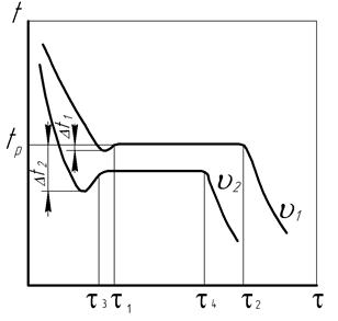 Рис. 13. Кривые кристаллизации металла при скоростях охлаждения V1<V2