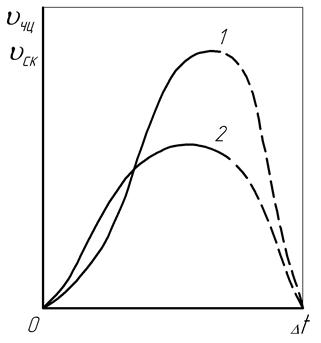 Рис. 14. Зависимость скорости роста числа центров кристаллизации Vчц (1) и скорости увеличения размера зерен Vск (2) от степени переохлаждения