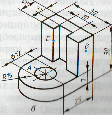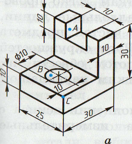Упражнения учащихся (самостоятельная работа) Чертеж детали Графическая работа. № 4 Закрепление нового материала. 1.С какой целью используют анализ геометрической формы предмета по чертежу? 2.Назовите последовательность действий при построении видов предмета? 3.Как наносят размеры фасок под углом 45 градусов? 4.Какие размеры являются габаритными. Обязательно ли указывать их на чертеже? 5. В какой степени анализ формы детали позволяет определить размеры, необходимые для нанесения на чертеже? 5) Выдача заданий и распределение по местам. III Самостоятельная работа учащихся, текущий инструктаж: (15-20 мин) По наглядному изображению одной из дета-лей постройте ее чертеж в прямоугольных про-екциях. Нанесите на чертеже проек-ции точек А, В и С Укажите размеры.