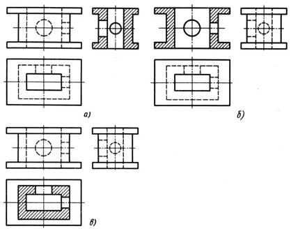 Определите и запишите в тетради, какие разрезы выполнены на рис. 222, а-в. Пример записи:...- простой горизонтальный разрез.