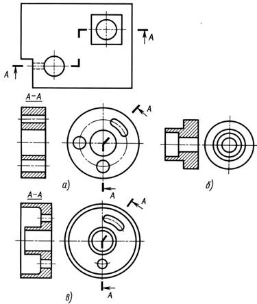 Ломаный разрез целесообразно применить в примерах на рис. 263, а и в, как это сделано на рис. 320.