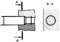В отверстии (рис.13,б) - сплошными основными линиями по внутреннему диаметру резьбы и сплошными тонкими линиями - по наружному (на плоскости, перпендикулярной оси отверстия, по наружному диаметру проводят дугу, равную 3,4 окружности, разомкнутую в любом месте). Сплошную тонкую линию при изображении резьбы наносят на расстоянии не менее 0,8 мм от основной линии и не более величины шага резьбы. Резьбу, как невидимую, изображают штриховыми линиями по наружному и внутреннему диаметрам.