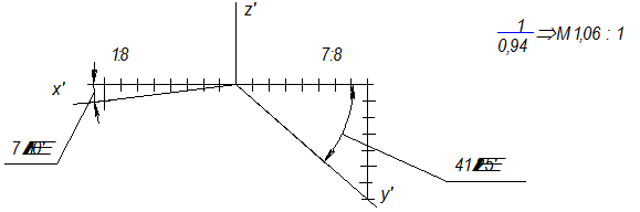 Прямоугольную диметрическую проекцию можно получить путем поворота и наклона координатных осей относительно П¢ так, чтобы показатели искажения по осям X' и Z' приняли равное значение, а по оси Y' - вдвое меньшее. Показатели искажения " kx " и " kz " будут равны 0,94, а " ky "- 0,47. На практике пользуются приведенными показателями, т.е. по осям X ' и Z' откладывают натуральные размеры, а по оси Y '- в 2 раза меньше натуральных. Ось Z' обычно располагают вертикально, ось X' - под углом 7°10¢ к горизонтальной линии, а ось Y' -под углом 41°25¢ к этой же линии (рис.12.17).