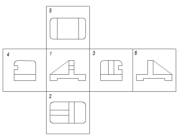 ВИДЫ Видом называется изображение обращенной к наблюдателю видимой части поверхности предмета. Различают основные, дополнительные и местные виды. Основные виды получают проецированием предмета на основные плоскости проекций. ГОСТ 2305-68 устанавливает следующие основные виды (см. рис. 3): вид спереди – 1 (главный вид); вид сверху – 2; вид слева – 3; вид справа – 4; вид снизу – 5; вид сзади – 6 (допускается располагать левее вида справа). За главный вид принимается вид спереди – фронтальная проекция предмета. Этот вид должен давать наиболее полное представление о форме и размерах предмета. Главный вид должен соответствовать положению детали, наиболее удобному для чтения изображений и размеров при ее изготовлении. Например, на рабочих чертежах валы изображают с горизонтальным расположением оси, независимо от положения вала в механизме. Невидимые контуры поверхностей следует показывать штриховыми линиями только при действительной необходимости, связанной с однозначным пониманием чертежа. Излишние штриховые линии увеличивают трудоемкость без пользы его понимания.