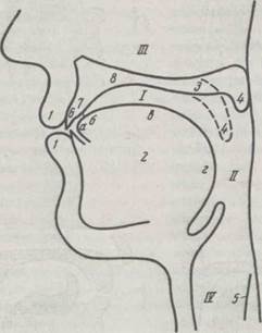 Рис. 1 Схематический разрез органов речи: I — полость рта; II — глотка; III — полость носа; IV — гортань Активные органы речи: 1 — губы; 2 — язык (а — кончик языка; б — передняя часть; в — средняя часть; г — задняя часть); 3 — мягкое нёбо; 4 — маленький язычок; 5 — голосовые связки Пассивные органы речи: 6 — верхние передние зубы; 7 — альвеолы; 8 — твердое нёбо