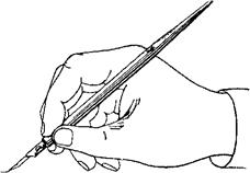 Правила обращения с перьевыми ручками: – торец ручки при письме должен смотреть в правое плечо работающего; – писать следует пишущей внутренней поверхностью пера так, чтобы обе створки пера касались бумаги; – недопустимо писать боковой поверхностью пера или его спинкой. Приемы те же, что и при черчении карандашом от руки, с той разницей, что перо – более тонкий инструмент и требует более осторожного обращения. Перо нужно держать так, чтобы обе половинки его рабочего конца в равной степени, легко и без нажима касались бумаги (рис. 9). Вычерчивание линии пером производится сверху вниз однообразным, равномерным движением пальцев руки на себя. Конец пера описывает короткую кривую в вертикальной плоскости, обращенную выпуклой стороной к бумаге. Каждый последующий штрих перекрывает нижний конец предыдущего, и линия постепенно наращивается. Длина штриха 0,5 – 1,0 мм. Таким образом, линия длиной 1 см состоит из 10 – 20 коротеньких штришков. При работе чертежным пером необходимо выполнять следующие рекомендации: – тушь следует набирать на внешнюю сторону (спинку) пера, внутренняя сторона пера должна оставаться сухой (рис. 10); – нельзя макать перо в тушь, и совершенно недопустимо упирать конец пера в дно флакона; – тушь набирают деревянной палочкой и переносят ее на спинку пера; при пользовании тушницей спинкой пера слегка касаются поверхности туши; – туши не должно быть слишком много – лучше лишний раз набрать тушь, чем посадить кляксу; – при засыхании туши перо вытирают влажной тряпочкой или отмачивают в воде, затем промывают и насухо вытирают.