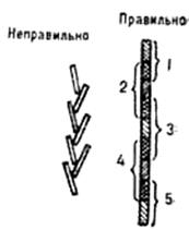 Рис. 8. Устранение раздвоения пера Некоторые недостатки пера можно устранить, подтачивая его на специальном брусочке. Заточку начинают с выравнивания створок пера по длине. Для этого перо вставляют в чертежную ручку и, держа ее перпендикулярно к плоскости мелкозернистого точильного бруска, водят по нему пером без нажима влево – вправо несколько раз. Когда створки пера станут одинаковыми по величине, приступают к заточке боковых граней. Для этого в разрез створок вставляют кусочек плотной бумаги, перо помещают в ручку и затачивают, легко нажимая на перо. Периодически концы створок осматривают через лупу. Ширина створок пера должна быть не более 0,5 мм. Как правило, после заточки образуются острые грани. Их закругляют, пользуясь бруском для правки опасных бритв или мелкозернистой наждачной бумагой, наклеенной на твердую ровную поверхность.