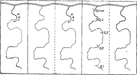 а б в Рис. 46. Способы вычерчивания ручьев и рек, изображаемых в одну линию: а – чертежным пером; б – кривоножкой (слева) с последующим постепенным утолщением линии чертежным пером (справа); в – кривоножкой по частям линиями разной толщины (слева) с последующим плавным соединением этих частей пером (справа)