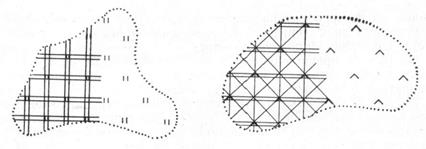 Условные знаки вычерчивают чертежным пером от руки или с помощью чертежных инструментов, строго соблюдая указанные в таблицах размеры. Условные знаки вычерчивают тонкими линиями, за исключением тех знаков, толщина которых указана в таблицах условных знаков. Вычерчивание площадных условных знаков аналогового отображения. Сельскохозяйственные угодья и земли, не используемые в сельском хозяйстве, выражающиеся в масштабе карты (плана), вычерчивают площадными условными знаками. Границы угодий намечают карандашом сплошными линиями, затем по этим линиям чертежным пером вычерчивают точечный пунктир. Диаметр точек 0,2 мм, расстояние между ними 1 мм. Точки пунктира вычерчивают круговым движением пера. Если граница угодий совпадает с дорогами, канавами или с какими-либо другими линейными условными знаками, то точки не вычерчивают. Точечный пунктир дает представление о конфигурации данного угодья, но не о его характеристике, поэтому площадь внутри контура заполняют площадными условными знаками. Примерами такого изображения могут служить условные знаки растительности и грунтов- Сенокос изображают условным знаком луга в виде двух вертикальных параллельных черточек, расположенных в шахматном порядке. Расстояние между значками зависит от масштаба плана. При нанесении условного знака сенокоса вычерчивают карандашом вспомогательную разграфку – сетку квадратов (рис. 59). Размер строк квадратов зависит от масштаба чертежа. На построенную сетку наносят высоту и ширину знака, размер которых берется из таблиц условных знаков нужного масштаба