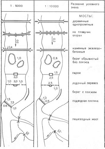Рис. 64. Надписи на реках Полевое черчение. Графическое оформление материалов дешифрирования аэрофотоснимков имеет свои особенности. Так, например, границы землепользования на аэрофотоснимках вычерчивают красной тушью, межевые столбы на поворотных пунктах границы изображают кружками. Если поворотные пункты опознаны или получены при помощи вспомогательных измерений на местности, то их изображают двойными кружками диаметром 4,0 и 3,0 мм, а границы между этими столбами показывают двумя параллельными линиями. В случае когда поворотные пункты границ не сохранились на местности, их вычерчивают без условного знака столба, но с указанием угла поворота. На аэрофотоснимках условную застройку в населенных пунктах изображают узкой полосой, но полосу застройки не заливают тушью. Условные знаки сельскохозяйственных угодий вычерчивают черной тушью. Сельскохозяйственные угодья нумеруют с запада на восток арабскими цифрами. При сложной ситуации местности аэрофотоснимки разбивают на секции, которые обозначают римскими цифрами. Все остальные объекты дешифрирования вычерчивают по таблицам условных знаков. В полевых условиях объекты дешифрирования обводят твердым карандашом или тупой иглой, внутри контура ставят один–два условных знака. К концу дня все отдешифрированные данные вычерчивают тушью. При сложной ситуации результаты полевого дешифрирования вычерчивают два раза в день. Разграфку при вычерчивании условных знаков на аэрофотоснимках не делают. Допускают разрежение знаков и отступление от установленных размеров. Перед дешифрированием поверхность снимка протирают жесткой резинкой, чтобы хорошо ложилась тушь. Аэрофотоснимки оформляют строго в границах рабочих площадей. Обязательно делают тщательную сводку контуров каждого аэроснимка. Камеральное черчение. Все элементы на фотопланах после дешифрирования вычерчивают с такими же требованиями, как и при составлении плана землепользования по геодезическим измерениям. Наносят подробные характеристики сельскохозяйственных угодий (выделяют контуры, засоренность камнями, засоленность, искусственное орошение и т. п.). Фотопланы вычерчивают черной тушью. Перед вычерчиванием фотоплан протирают жесткой резинкой или пемзой, чтобы лучше ложилась тушь. В первую очередь вычерчивают геодезические пункты, затем дорожную сеть и все угодья. Заполняющие контуры условные знаки по предварительной разграфке наносят тушью, точно придерживаясь таблиц и условных знаков. Исключение составляет изображение сельского населенного пункта, где застроенная часть изображается узкой полосой, которая для планов масштаба 1: 10000 заштриховывается, а для масштаба 1:25000 заливается черной тушью. После вычерчивания всех условных знаков фотоплан оформляют. Все надписи и цифровые характеристики наклеивают на фотоплан.