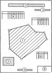 Компоновка плана зависит от размера и формы территории, количества наносимой на чертеж информации (рис. 65). Вначале размечают место для территории землепользования 1, которая должна располагаться в центре. Заголовок или адрес проектируемого объекта 2 размещают вверху чертежа. Год 3 съемки помещают под заголовком. Экспликацию земель 4 (от лат. explicatio – истолкование, объяснение), т.е. свод пояснений к видам использования земель, по хозяйственным участкам 5 и посторонних пользователей 6 размещают на свободных местах. Описание границ смежных земель 7 помещают под территорией землепользования с левой стороны. Штамп 8 вычерчивают всегда в нижнем правом углу. Масштаб 9 иногда располагают посредине внизу листа, но обязательно указывают его в штампе. После отработки компоновки на миллиметровой бумаге приступают к составлению плана на твердой основе. Вычерчивание территории землепользования начинают с построения линейкой Дробышева координатной сетки, затем по координатам наносят границы землепользования, населенные пункты и основные дороги. Эти элементы копируют на восковку и с топографической основы на эту же восковку переносят границы всех угодий, гидрографию и другие элементы ситуации. С восковки ситуацию передавливают на план территории землепользования. Перенесенную ситуацию проверяют и вычерчивают тушью в соответствии с условными знаками. Допускается на больших территориях расставлять условные знаки угодий в два–три раза реже, чем в таблицах условных знаков.