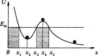 Как и раньше, области, где потенциальная энергия больше полной, недоступны для движения частицы. Первая область: от 0 до х1, вторая:х3 до х5. В области от х1 до х3 Рис.7 движение ограниченное, т.е. финитное. В области от х5 до бесконечности потенциальная энергия меньше полной и движение здесь дозволено. Такое движение называется инфинитным или неограниченным. Шарик в таком желобе может выполнять колебания в потенциальной яме, либо покатиться в бесконечность, если уже находится правее потенциального барьера. Для того чтобы преодолеть барьер, шарик должен обладать полной энергией, большей потенциального барьера. В противном случае говорят, что частица не может преодолеть потенциальный барьер.